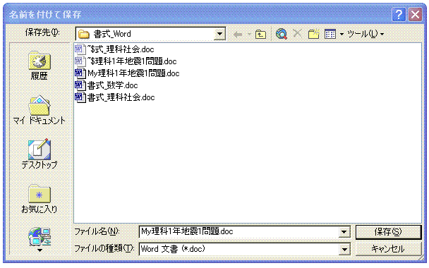 ここでは,「書式_理科社会.doc」を消して「My理科1年地震2問題.doc」とキーボードから書き込み,