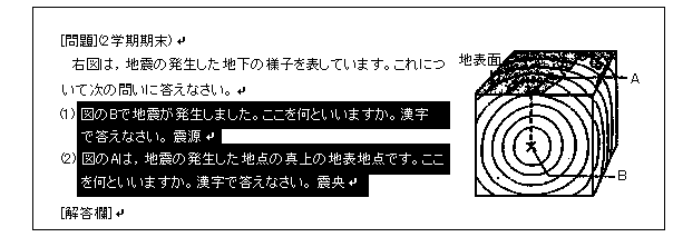 ・最初の[問題]の「(1) 図のBで地震が発生しました。ここを何といいますか。漢字で答えなさい。」の「・・・さい。」のすぐ後ろに,
