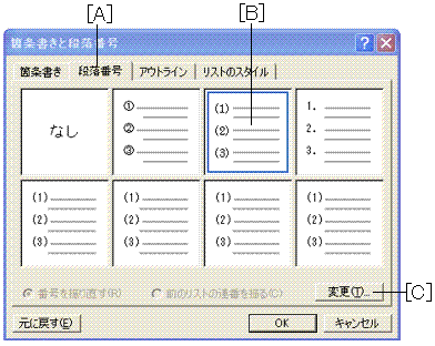 ・すると,「箇条書きと段落番号」のダイアログが出てきます。右図の[A]の部分の「段落番号」を左クリックすると,右図のように表示されます。