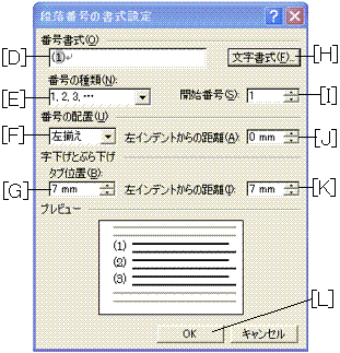 ・[G]の「タブ位置」は「7mm」,[I]の開始番号は「1」,[J]の「左インデントからの距離」は「0mm」,[K]の「左インデントからの距離」は「7mm」に設定します。それぞれの枠の右側にある小さな[▲]と[▼]を左クリックすれば数値を増減できます。
